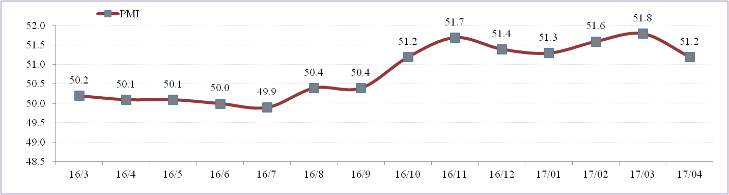 4月份中國制造業采購經理指數(PMI)為51.2%,環比下降0.6個百分點;其中,生產指數和新訂單指數為53.8%和52.3%,分別比上月回落0.4和1.0個百分點,生產和新訂單仍位于擴張區間但兩者差值擴大至1.5個百分點,供需矛盾進一步擴大。