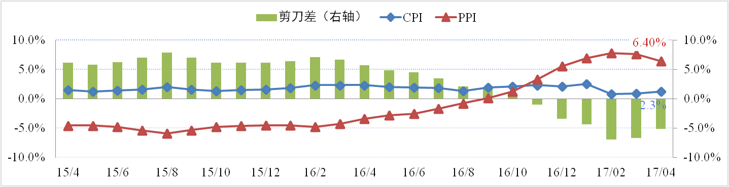 4月份CPI同比上漲1.2%,環比上漲0.1%;PPI同比上漲6.4%,環比回落0.4%。CPI連續兩個月回升,PPI連續兩個月回落,“剪刀差”進一步收窄,物價形勢總體平穩。PPI漲幅回落主要受補庫存接近尾聲、需求收縮、大宗商品價格下跌以及去年低基數效應影響。