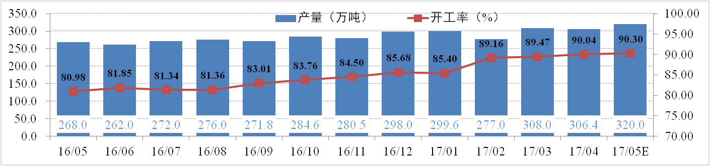 分析認為:供給側(cè)改革政策已經(jīng)落地,短期內(nèi)仍難以改變供需格局,因此市場供應(yīng)仍將保持在高位。預(yù)期5月產(chǎn)量320萬噸,日化產(chǎn)量10.32萬噸,供應(yīng)持續(xù)增加。