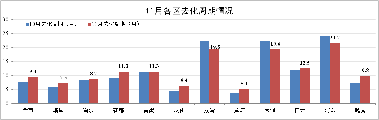 11月份廣州住宅地產(chǎn)去化周期為9.4個(gè)月,環(huán)比10月增加1.6個(gè)月,總體庫(kù)存量為763.68萬(wàn)m²,增城、花都等熱門區(qū)域由于新批預(yù)售集中在11月,拉動(dòng)整體庫(kù)存量增加。